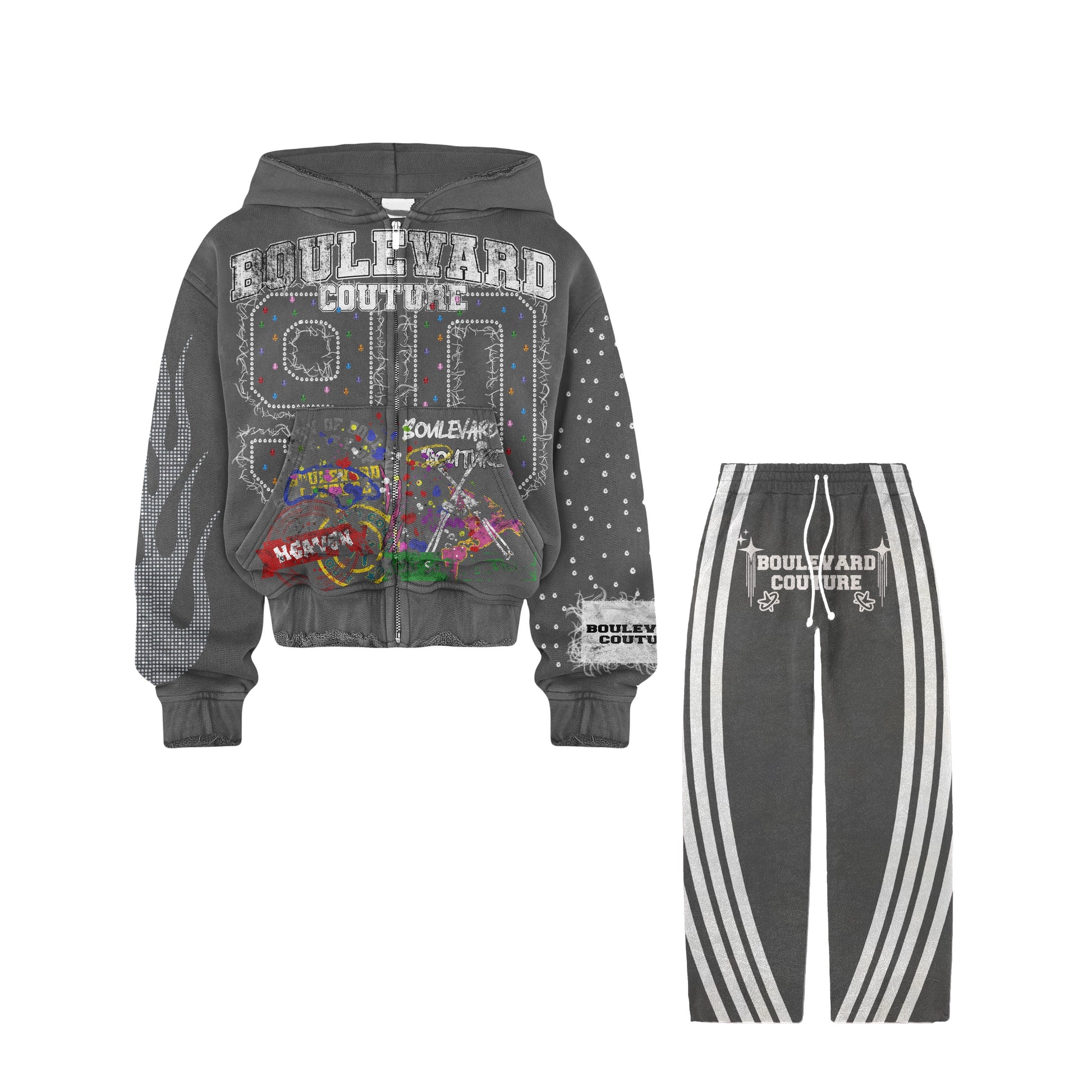 This set balances grayscale tones with electric artwork, perfect for those who like their fashion with edge and energy.